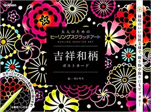 日本の古典柄には、夫婦円満、家内安全の「波千鳥」、長寿延命の「菊」、魔除け・運命向上の「水引」など、さまざまな願いが込められた、縁起のいい「吉祥文様」があります。これまでもこのシリーズを手がけてきた作家のヨシヤス氏に、今回もその文様をテーマにスクラッチ専用のオリジナルアートを描き起こしていただきました。素敵な和柄に願いを込めて削り、お部屋に飾ったり、吉祥文様の説明が入ったカードの裏面にメッセージを書いて、友人に贈ったりするものおすすめです。ピッタリサイズ(洋形2号)の封筒付き。